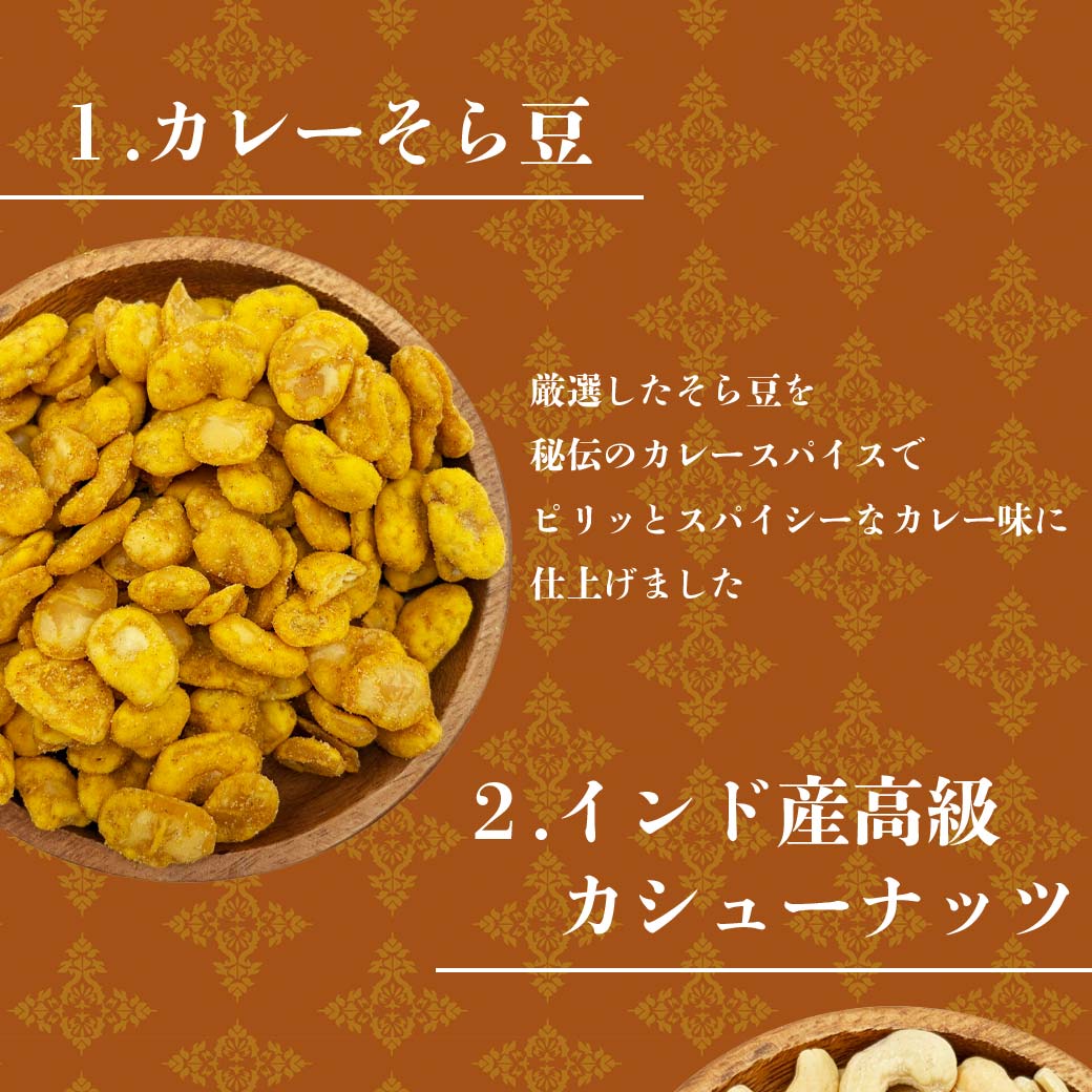 インド産カシューとカレーそら豆・ピーナッツをブレンドして、秘伝のカレーパウダーで、ビールのつまみにピッタリのおつまみナッツになりました。