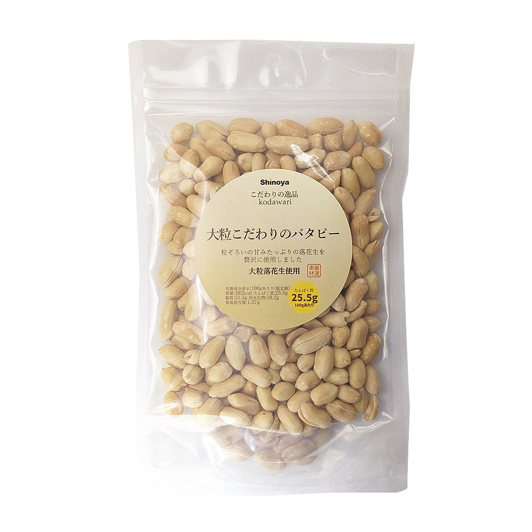 | 落花生(中国)、植物油、食塩 栄養成分表示 100gあたり 熱量:592kcal たんぱく質:25.5g 脂質:51.3g 炭水化物:18.2g 食塩相当量:1.57g |